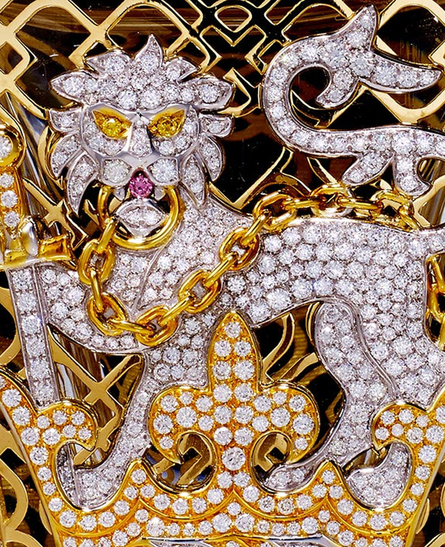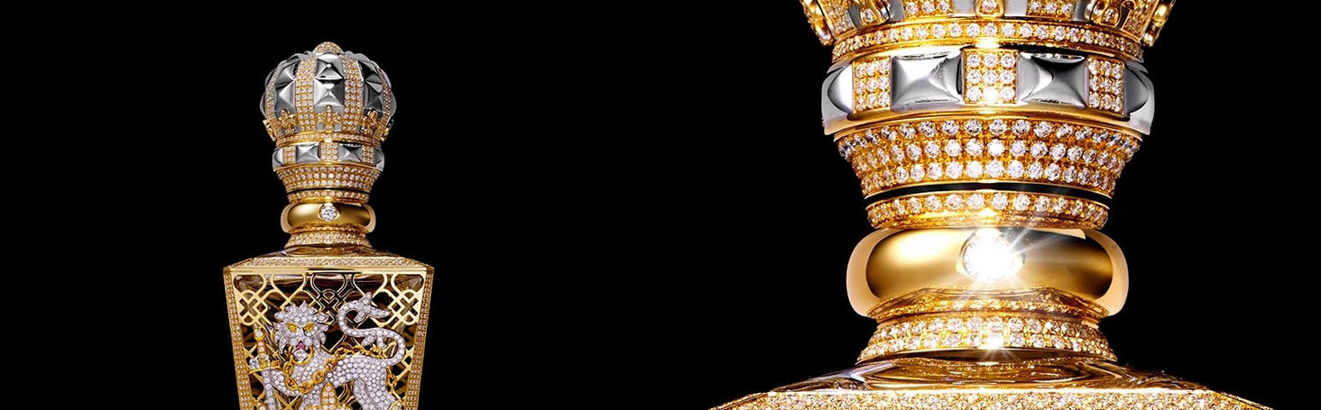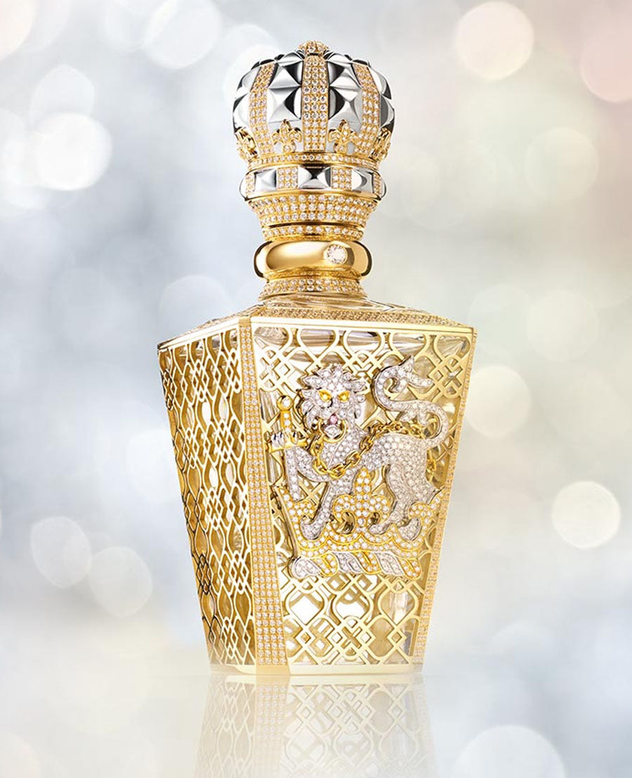 Clive Christian has named this rare work of exquisite craftmanship No1 Passant Guardant. Taking the perfume house’s signature crystal bottle and adorning it in fine, handcrafted, 24 carat gold lattice-work, creating a glittering ode to pure perfume. The upper part of the heraldic crest is from Clive Christian’s own coat of arms, awarded by Queen Elizabeth II’s Royal College of Arms in 1999 and dating to when he took custodianship of the Crown Perfumery. Embedded in the lattice-work are more than 2000 individually set flawless white diamonds. Set in the eyes of the lion standing “passant guardant” over the Crown are two yellow diamonds, whilst a rare pink diamond marks out the lion’s tongue. This work of art is a sensually opulent homage to the fragrance within, No1 Sandalwood. Price on request, please email Customerservice@clive.com