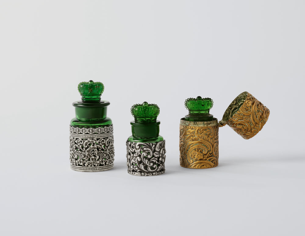 For a beautiful presentation in the boudoir or drawing room, the bottle was placed in a silver holder that was monogrammed, filigreed or embossed. Travel size bottles in kid leather pouches or silver became popular for the touring worldly elite.